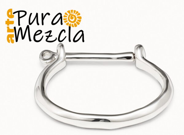 Pulsera rígida unisex, bañada en plata, con un original diseño que recuerda una herradura y con cierre en forma de grillete. Elaborado en España y siguiendo un proceso cien por cien artesanal. Un regalo perfecto para ti y para quien tú quieras.